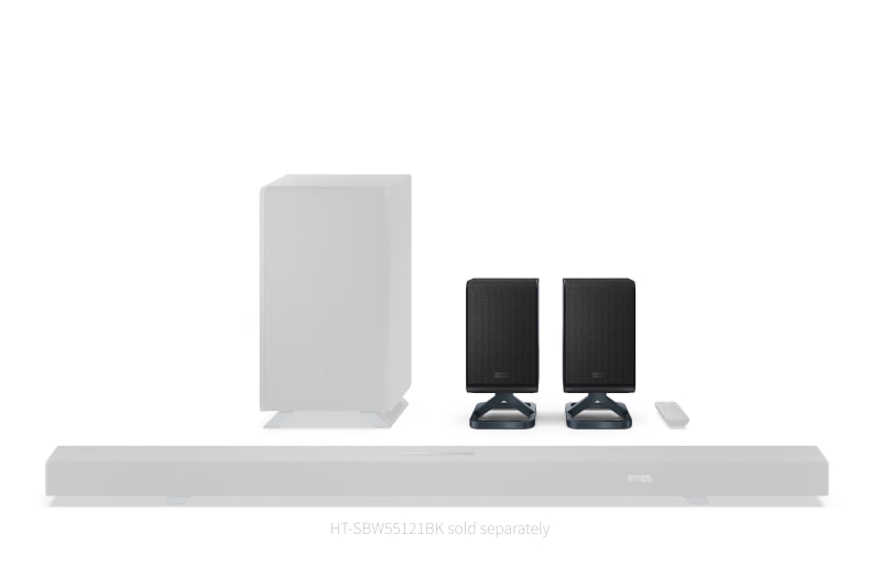 HT-SPR52021 1.0.1 Alto-falantes Traseiros Sem Fio x2, 2 x pés elevados (fixados no alto-falante), 2 x pés baixos, Cabos de alimentação, Fixações de montagem na parede, Documentação do utilizador