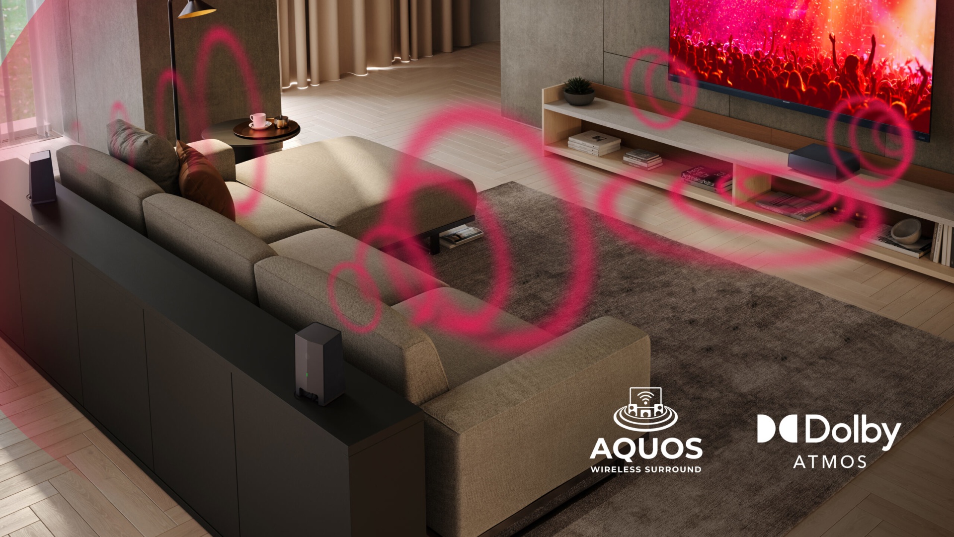 Ligue o seu televisor SHARP com AQUOS Wireless Surround (AWS) ativado para uma experiência de som melhorada e envolvente